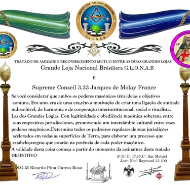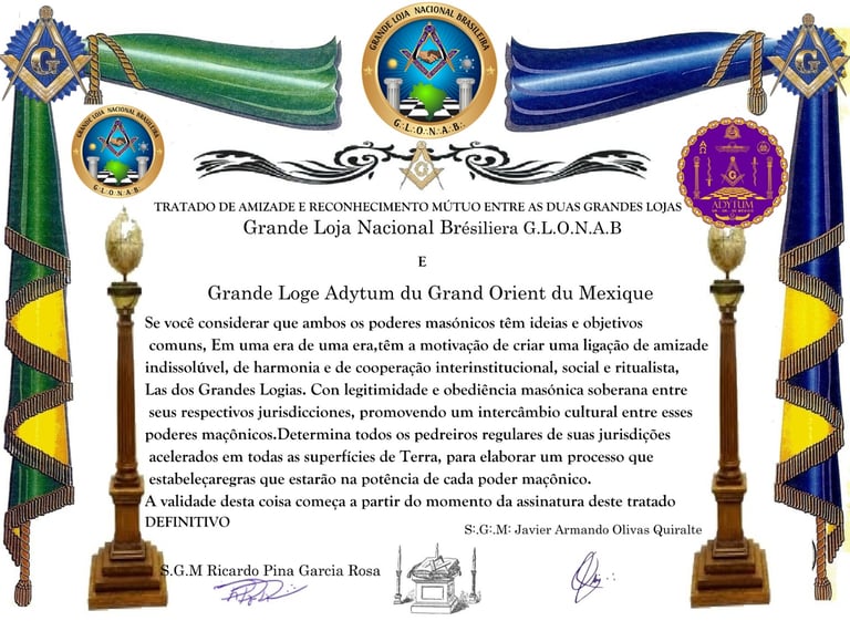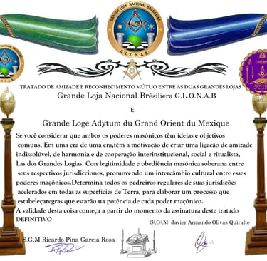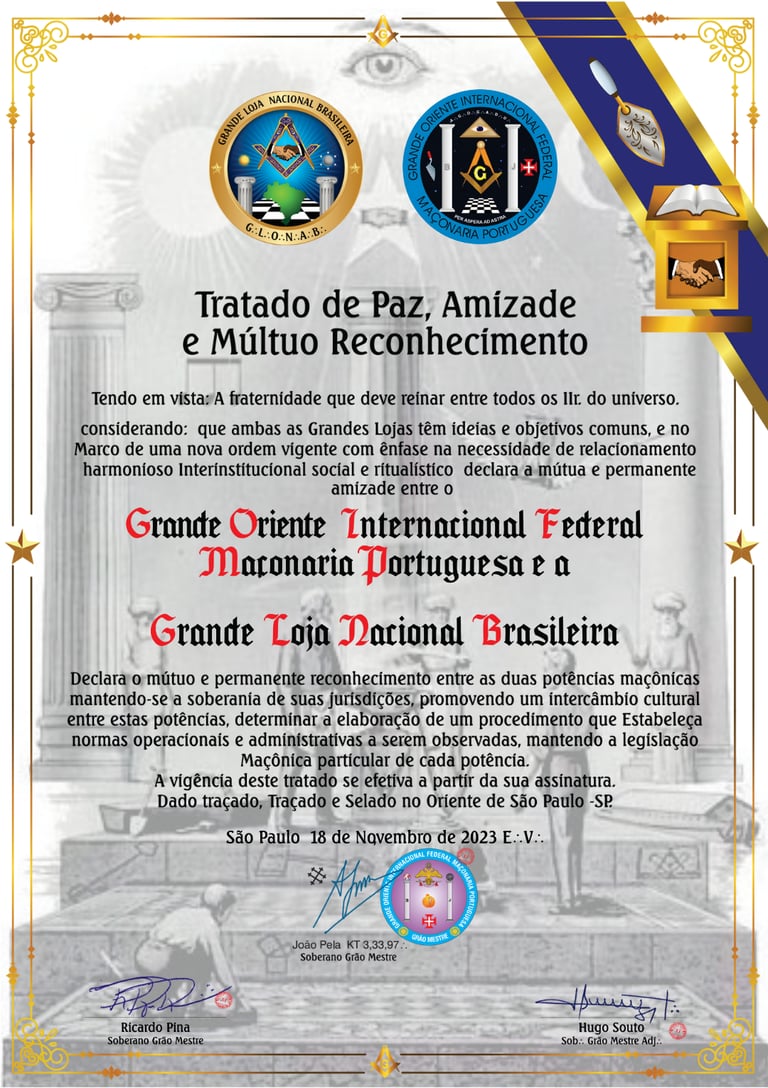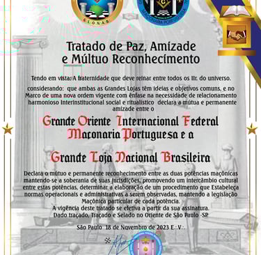 A Maçonaria é uma fraternidade universal baseada nos princípios da liberdade, igualdade e fraternidade, cultivando o respeito entre todos os povos e instituições regulares. Em nosso caminho, buscamos fortalecer laços de amizade e entendimento mútuo, independentemente da existência formal de um Tratado.
