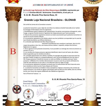 A Glonab reafirma seu compromisso com a fraternidade maçônica mundial, respeitando e reconhecendo todas as Potências Regulares que compartilham os princípios fundamentais da Tradição Maçônica. Nossa relação de amizade transcende documentos e formalidades, pois acreditamos que a verdadeira irmandade se constrói na prática diária da Virtude, da Tolerância e do respeito aos Landmarks.